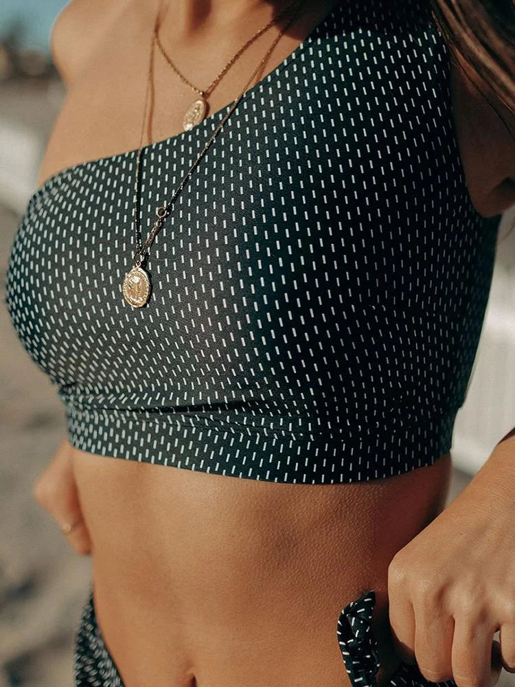 A one shoulder wonder meets midnight dash for a swimsuit that's almost too good to be true. Eye-catching and head-turning. this Fit swim top provides support and makes a statement all at the same time. The shelf bra and fully lined crop provides support and coverage.